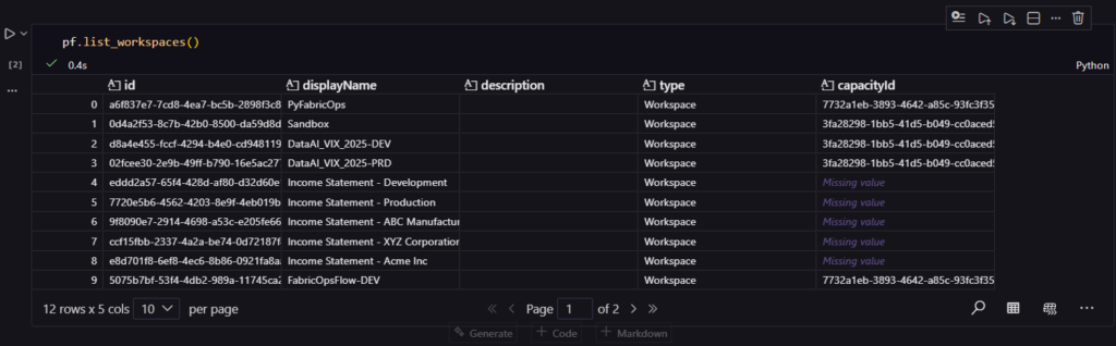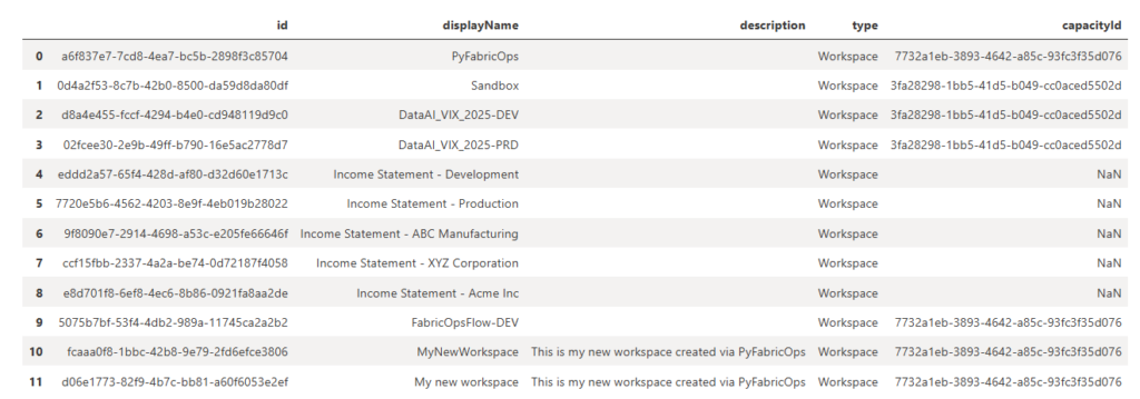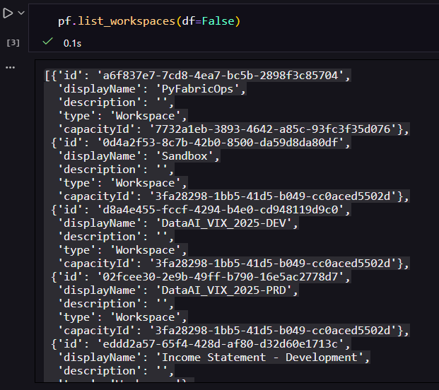 Atente-se ao método de autenticação que está executando, pois neste exemplo, se rodar o comando usando a autenticação interativa irá coletar os workspaces que aquele usuário tem acesso. Já se executar pelo Service Principal irá obter os workspaces que o service principal tem acesso.