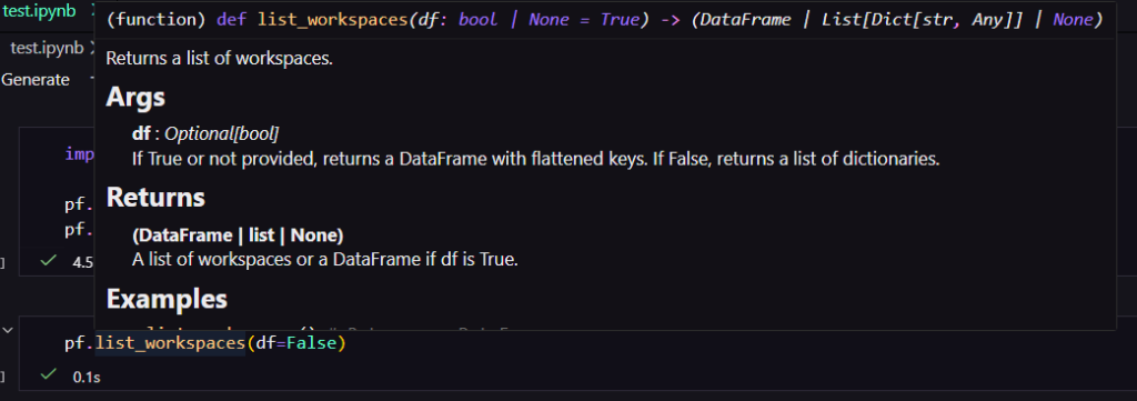 Além disso você pode apenas passar o mouse sobre cada função que você poderá conferir os argumentos, retorno e exemplos nas docstrings.