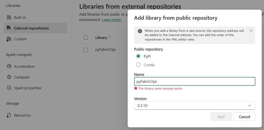 Há duas formas de instalar a biblioteca no Microsoft Fabric. A primeira é temporária, ou seja, apenas durante a sessão ativa. Exige a reinstalação a cada início da sessão. Este tipo serve apenas para algo pontual, alguma manipulação esporádica, um teste apenas.
