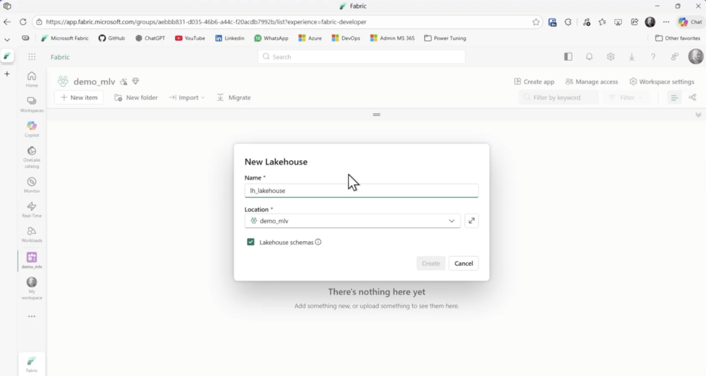 Clique em novo item e crie o lakehouse chamado lh_lakehouse. Habilite a caixa Lakehouse schemas
