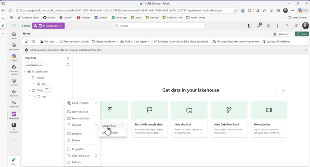 Após importar os notebooks, abra o lakehouse e crie uma subpasta chamada raw dentro de Files clicando nos três pontinhos.