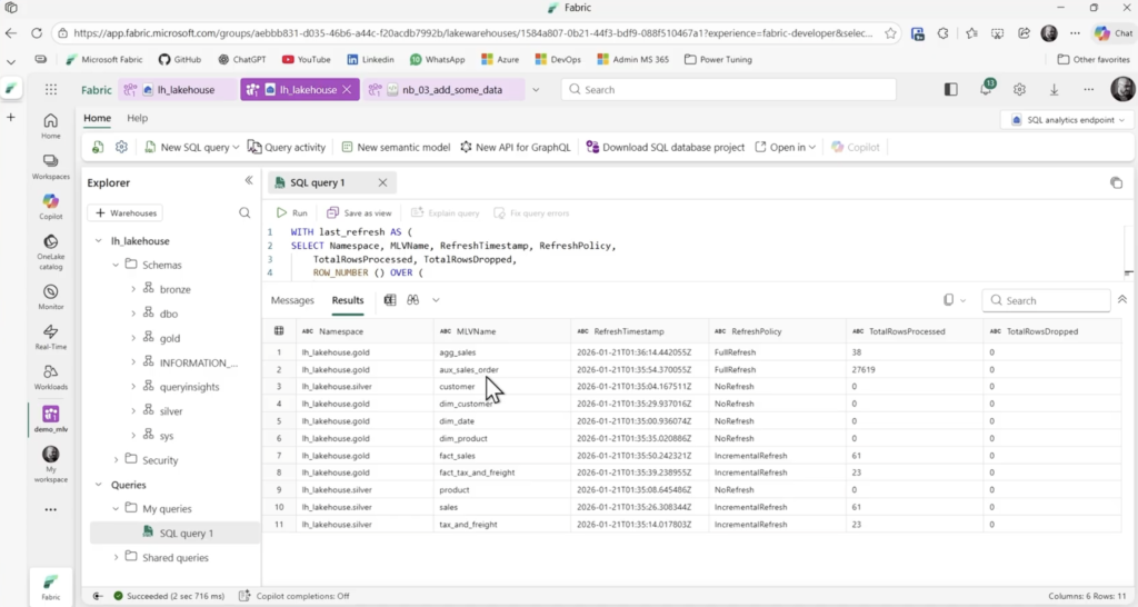 Para conferir as execuções dos refreshes você pode voltar para o lakehouse e ir até o SQL analytics endpoint e executar a query abaixo que também está no material do download.